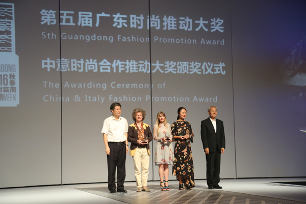 在本屆廣東時裝周的開幕晚會上,廣東省服裝服飾行業(yè)協(xié)會、廣東省服裝設計師協(xié)會特別在第五屆廣東時尚推動大獎中,專門設立了“中意時尚合作推動大獎”,用以表彰和感謝意大利國家時尚協(xié)會、米蘭時裝周藝術總監(jiān)Orietta Pelizzari女士、意大利米蘭國際時裝周的藝術顧問Matteo Bardi先生。